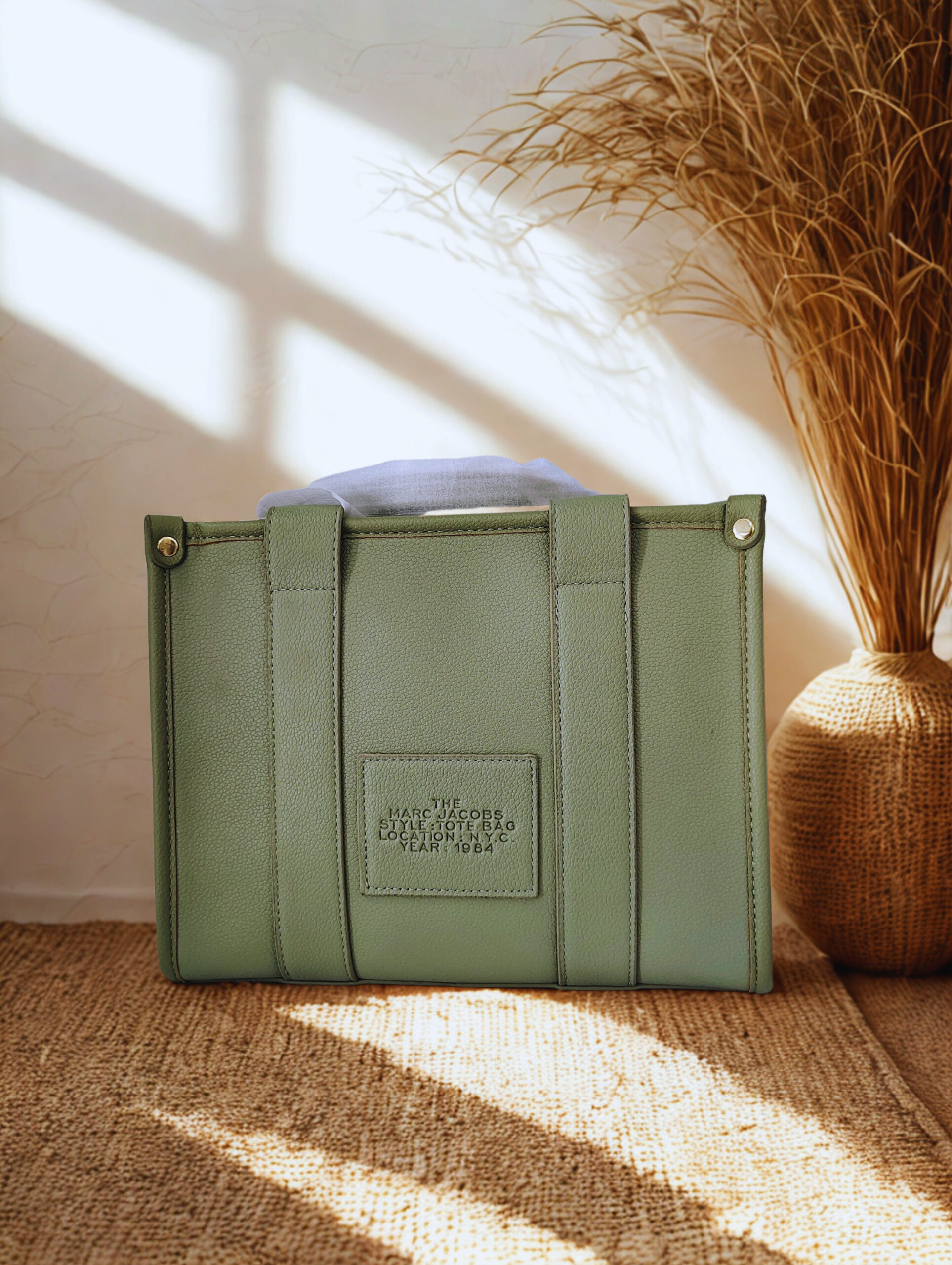 A structured sage green tote bag by Marc Jacobs, featuring a pebbled leather finish dual top handles, gold-tone hardware, and a front. logo patch with brand details.