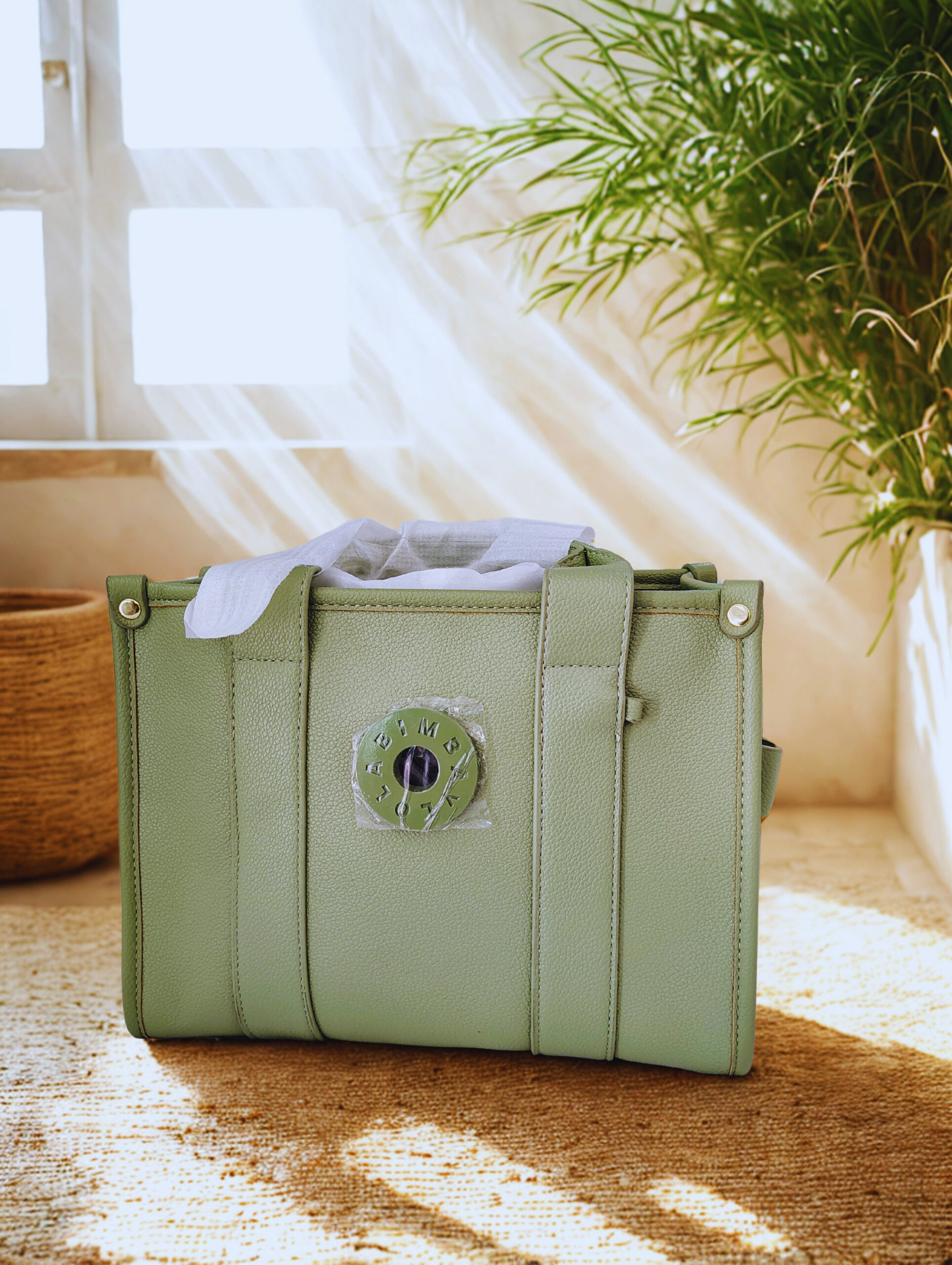 This is a structured tote-style Handbag in a muted sage green color. It features textured leather or faux leather with a pebbled finish. Boxy and structured shape with clean lines, with two sturdy top handles for carrying. It has a gold-tone rivets on the upper corners for adding durability and aesthetic. This is a stylish and minimalistic piece, typical of Marc Jacobs' modern yet practical design ethos.